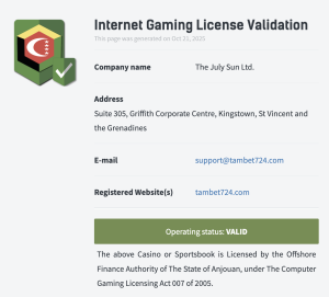Tambet, Anjouan Adası Hükûmeti tarafından ALSI-202503031-FI2 lisans numarası ile yetkilendirilmiştir. Tüm şans oyunları ve bahis hizmetleri yasal çerçevede sunulmaktadır. Lisans, kullanıcıların güvenli ve adil bir oyun ortamında işlem yapmasını sağlar. Aynı zamanda ödemeler ve kişisel bilgiler lisans kapsamında korunur. Üyeler, platformda gönül rahatlığıyla oyun ve bahis deneyimi yaşayabilir.